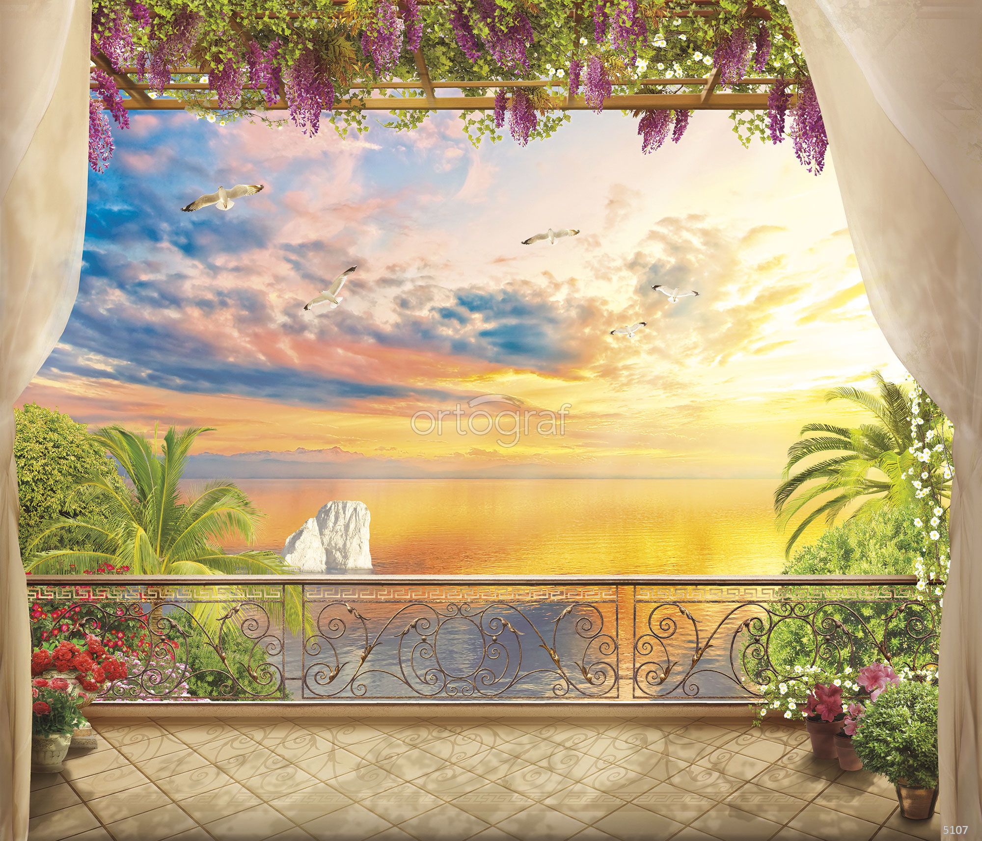 Терраса с изящными перилами и цветущей глицинией открывает вид на море, закат и летящих чаек, создавая атмосферу отдыха и вдохновения. В композиции много света, флоры и ощущение свежести, пространство кажется расширенным благодаря открытому виду вдаль. Такой сюжет отлично подойдёт для интерьеров, где важно подчеркнуть лёгкость и романтику.