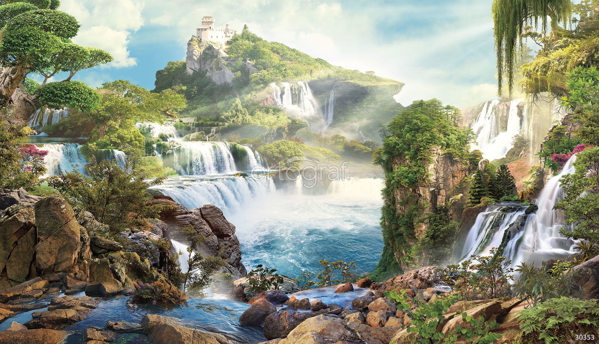 На изображении изображён волшебный фантазийный пейзаж: многоуровневые мощные водопады с кристально чистой голубой водой окружают цветущие скалы, поросшие густой зеленью. На вершине утёса возвышается сказочный замок, словно часть мифического мира. Композиция наполнена свежестью, природным великолепием и ощущением уединённого уголка, скрытого от цивилизации.