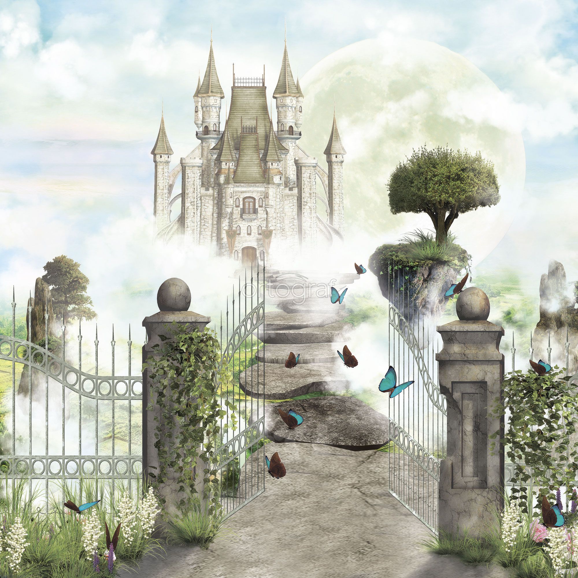 Сказочный замок в туманной дымке, открытые ворота, летающие бабочки и парящие острова создают атмосферу волшебства, мечты и приключения. Такой рисунок идеально подойдет для создания уюта и вдохновения, станет ярким акцентом в интерьере для детей или творческих людей.