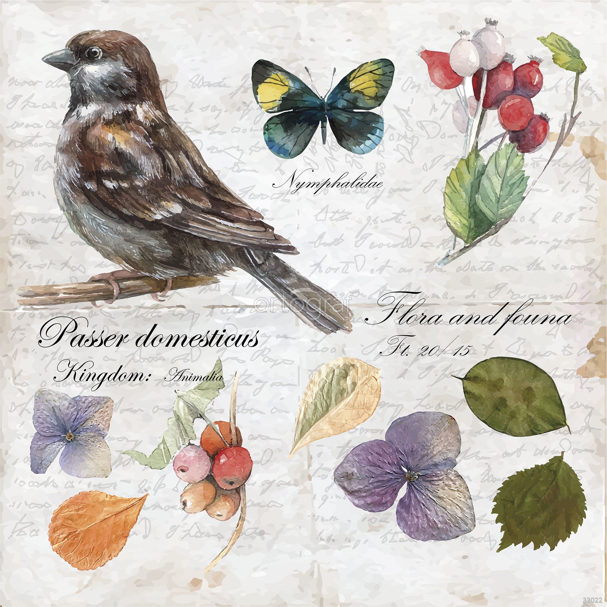 На изображении изображён воробей, экзотическая бабочка, различные ягоды и листья, а также цветы, выполненные в стиле ботанической иллюстрации с подписями на фоне рукописного текста. Композиция подчёркивает красоту природы, сочетает в себе элементы флоры и фауны, создавая утончённую и познавательную атмосферу. Такой рисунок отлично подойдёт для оформления гостиной, кухни или офиса.