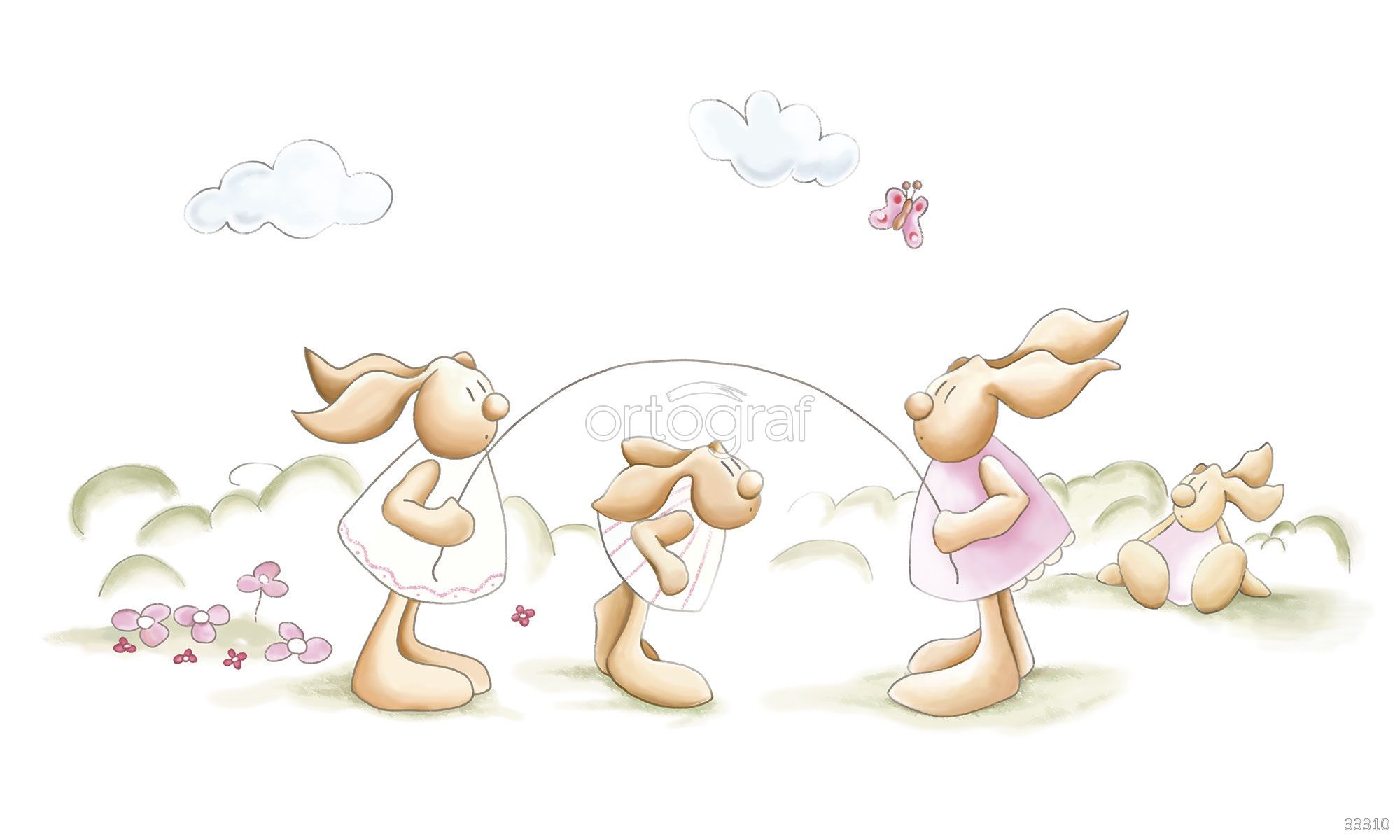 Иллюстрация с милыми зайчиками, которые играют на лугу в резиночки, окруженные цветами, облаками и бабочкой, создает атмосферу веселья и уюта. Сюжет наполняет интерьер теплотой, заботой и беззаботностью детских игр на свежем воздухе. Такой рисунок прекрасно подойдет для создания тёплой и радостной обстановки в детской комнате.