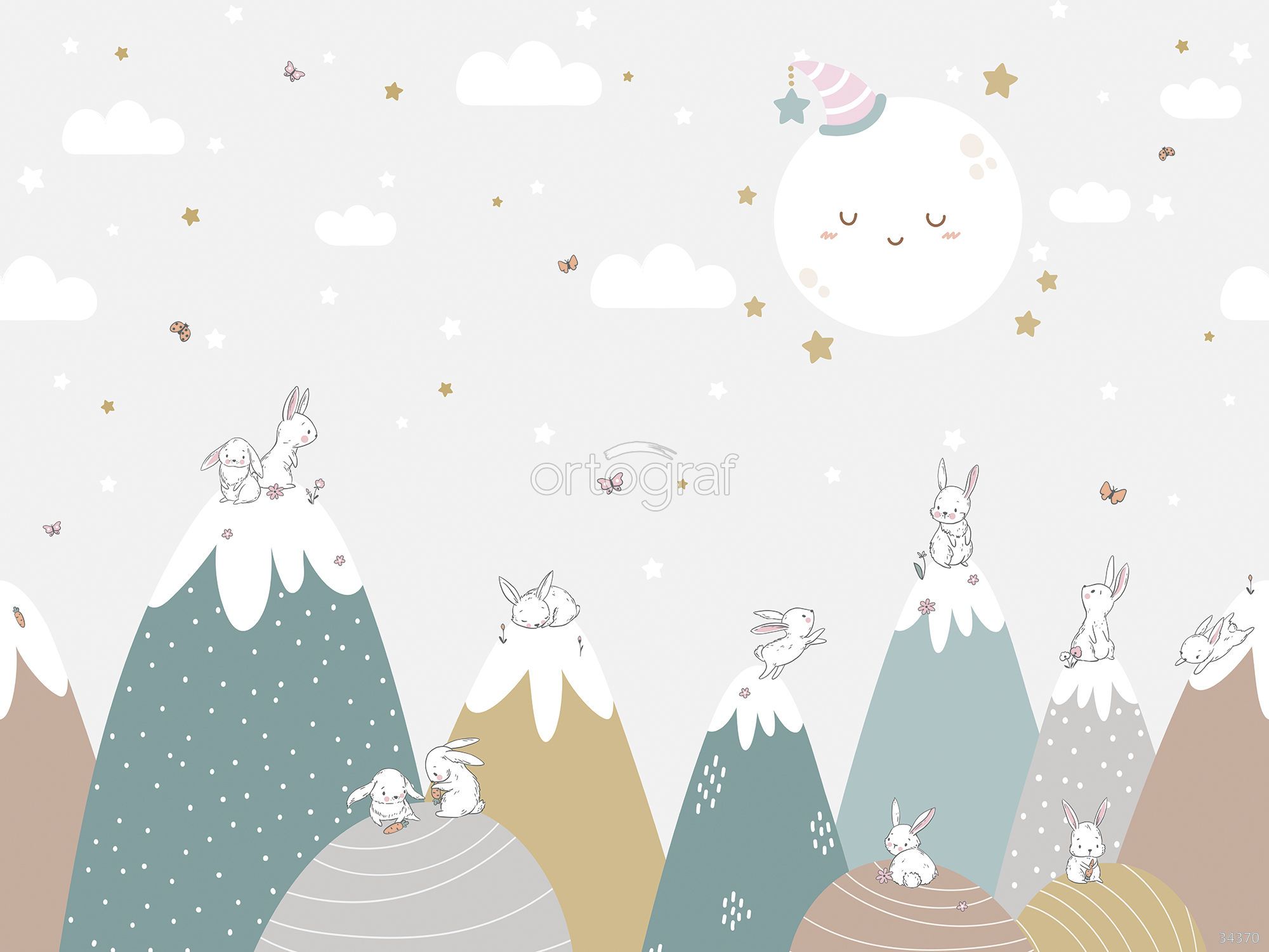 На этом изображении показаны забавные кролики, уютно расположившиеся на вершинах гор среди облаков, звёзд и луны в колпачке. Иллюстрация создаёт атмосферу нежности, спокойствия и сказочного сна, отлично подходит для оформления пространства, способствующего расслаблению и уюту. Такой сюжет идеален для помещений, где необходима атмосфера отдыха и уюта.