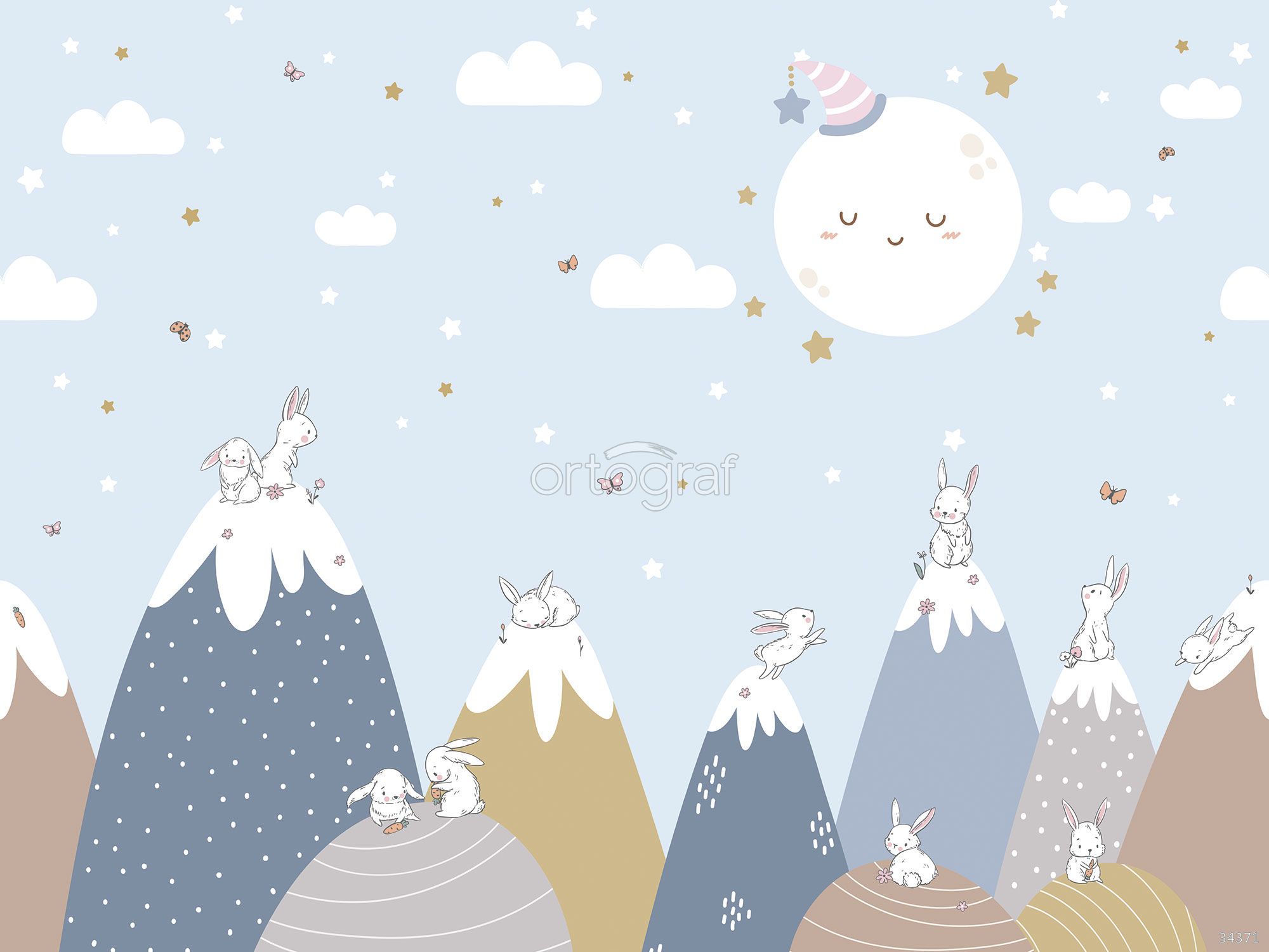 На этом изображении показаны забавные кролики, уютно расположившиеся на вершинах гор среди облаков, звёзд и луны в колпачке. Иллюстрация создаёт атмосферу нежности, спокойствия и сказочного сна, отлично подходит для оформления пространства, способствующего расслаблению и уюту. Такой сюжет идеален для помещений, где необходима атмосфера отдыха и уюта.