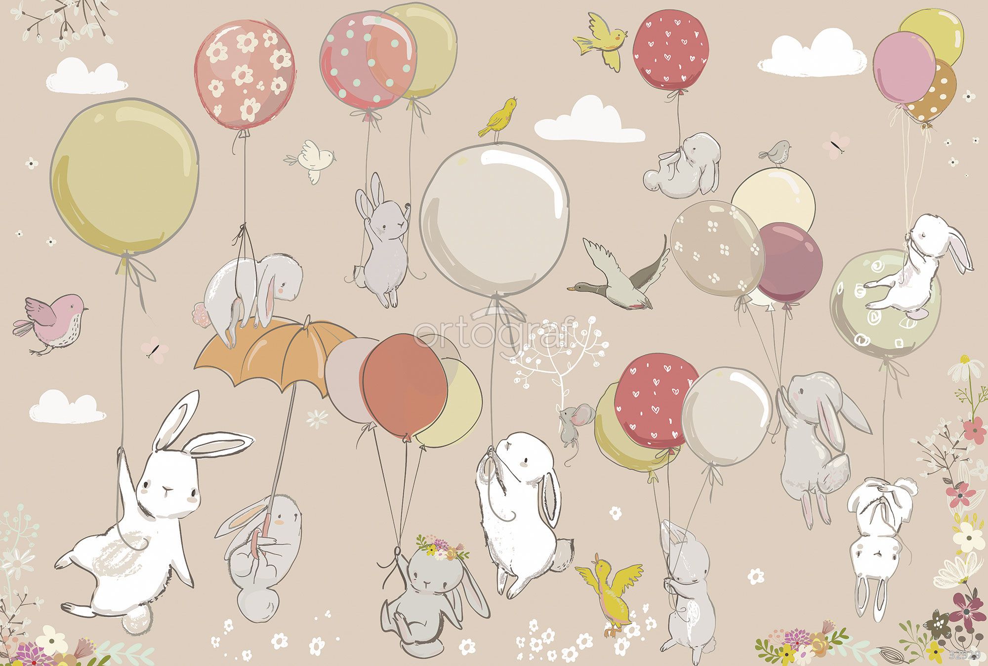 На изображении изображены кролики, которые летают на воздушных шарах и зонтиках среди облаков, птиц и цветов. Иллюстрация передаёт атмосферу легкости и радости, создавая сказочное настроение, идеально подходящее для детских комнат. Такой сюжет способствует развитию воображения и дарит ощущение уюта и беззаботности.