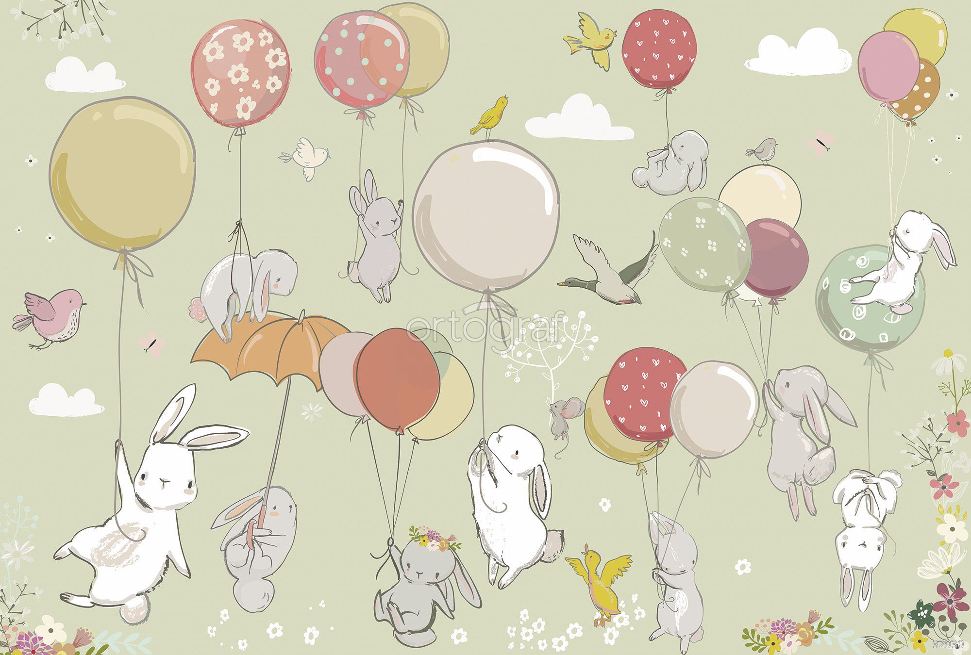 На изображении изображены кролики, которые летают на воздушных шарах и зонтиках среди облаков, птиц и цветов. Иллюстрация передаёт атмосферу легкости и радости, создавая сказочное настроение, идеально подходящее для детских комнат. Такой сюжет способствует развитию воображения и дарит ощущение уюта и беззаботности.