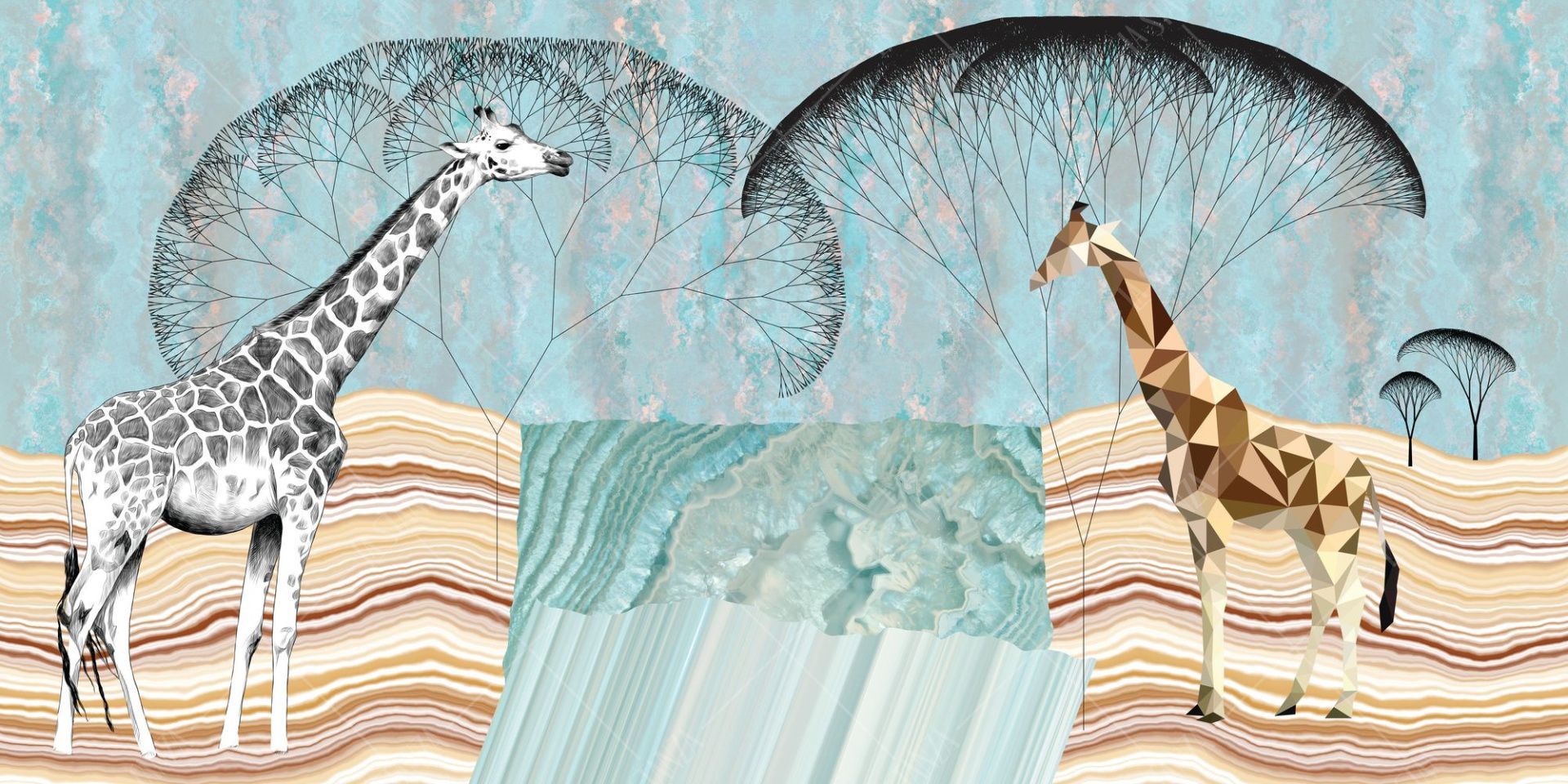 Фреска Жирафы и деревья на мятном фоне
