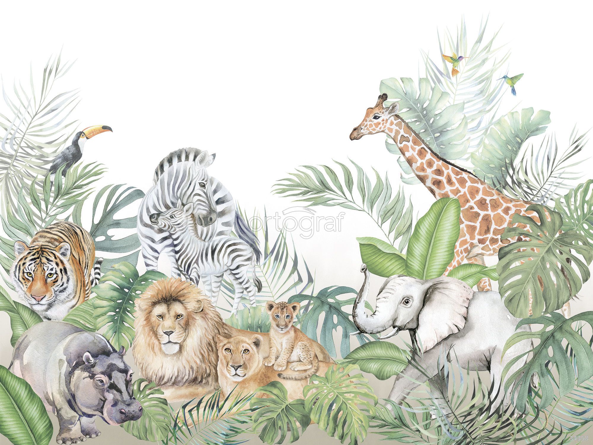 На изображении представлен яркий сюжет с животными саванны и тропического леса среди обилия крупных листьев и зелени. Здесь изображены тигр, лев с львёнком, бегемот, зебра с жеребёнком, жираф, слон, тукан и две колибри, создавая атмосферу настоящего приключения в мире дикой природы. Такой рисунок вдохновляет на изучение животных и отлично подойдет для оформления пространства, где важны воображение и любознательность.