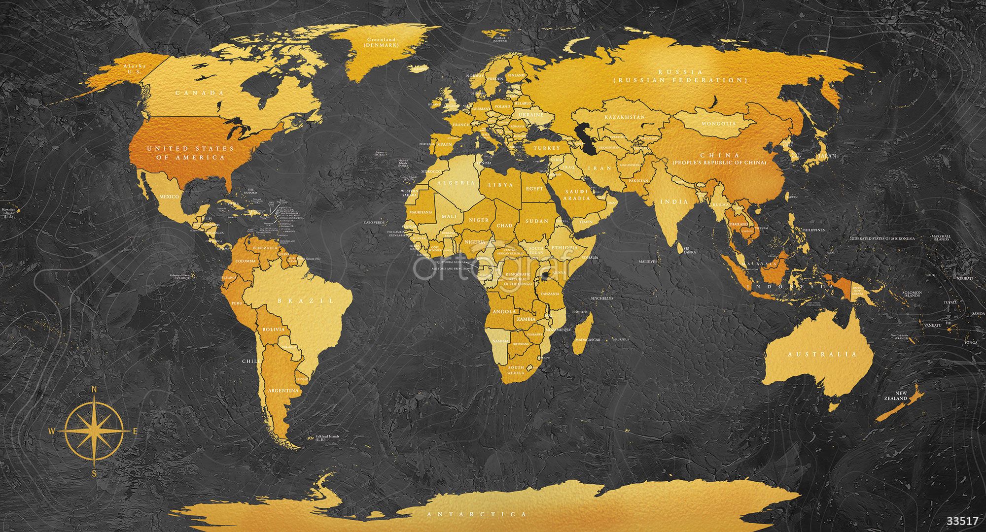 Современное изображение политической карты мира с четким выделением стран и границ на текстурированном фоне. Такой дизайн отлично подойдёт для рабочих и образовательных пространств, помогая ориентироваться в географии и придавая интерьеру интеллектуальный акцент. Особенно уместен в помещениях, где ценится деловой стиль и обстановка для учёбы.
