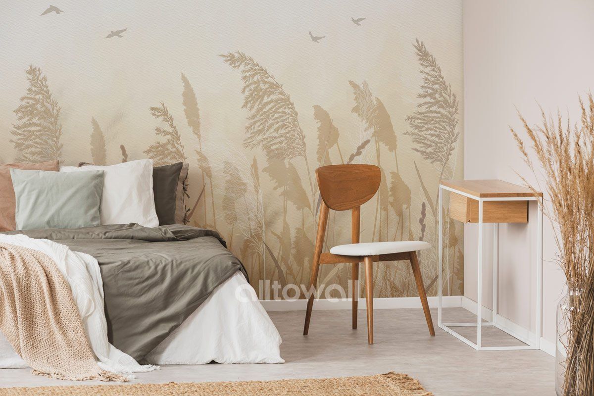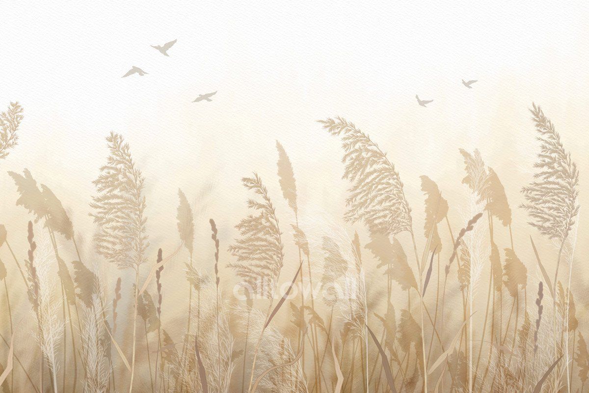Нежные обои с колосьями и травами в акварельной технике. «Золото полей» — сюжет в тёплых тонах для уютной спальни или гостиной.
