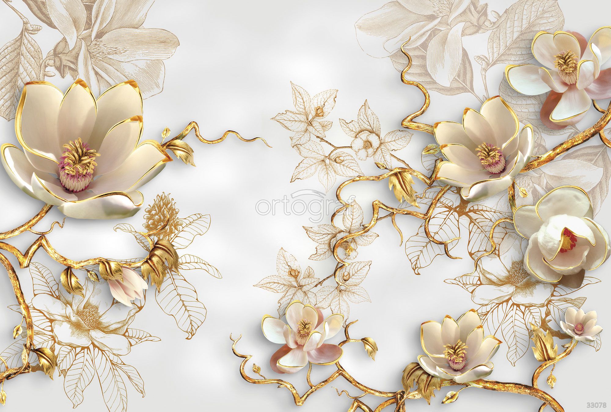 Роскошная композиция с объемными цветами и художественными ветвями на фоне изысканных графичных листьев создает элегантное и торжественное настроение. Такой сюжет подчеркнёт утонченность и изящество интерьера, добавит элемент роскоши и гармонии. Прекрасно смотрится в стильных и романтических помещениях.