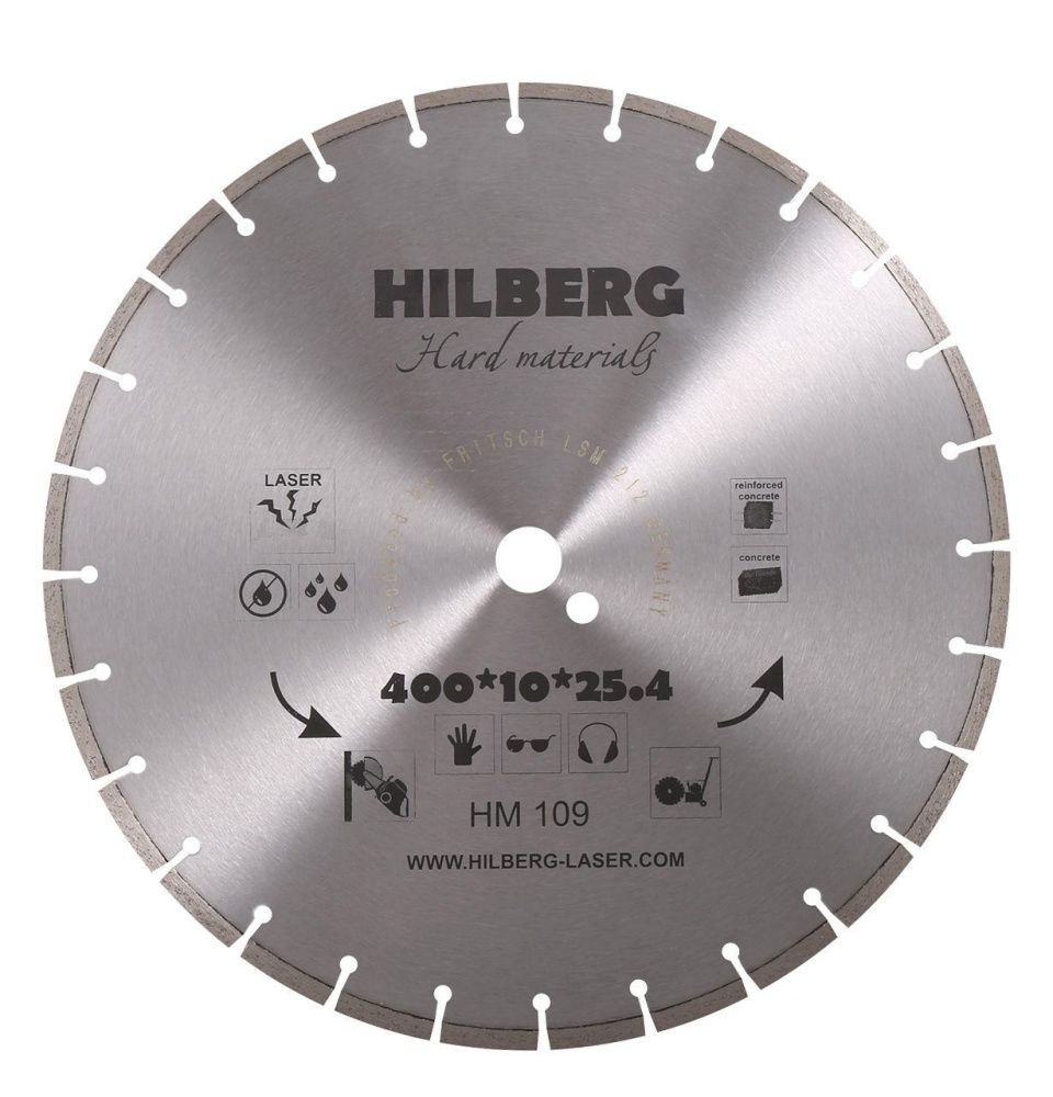 Диск алмазный Hilberg Hard Materials Лазер 400*10*25.4/12 mm Hilberg серия Hard Materials Laser Назначение: армированный бетон, железобетон, твердый бетон, бетон, огнеупоры, гранит. Особенности: все диски данной серии произведены на немецком оборудовании Dr. Fritsch методом лазерной наварки сегментов. Подтверждены сертификатом соответствия системы менеджмента качества требованиям ISO 9000, а также многочисленными дипломами и благодарственными письмами. Технология производства: Лазерная наварка