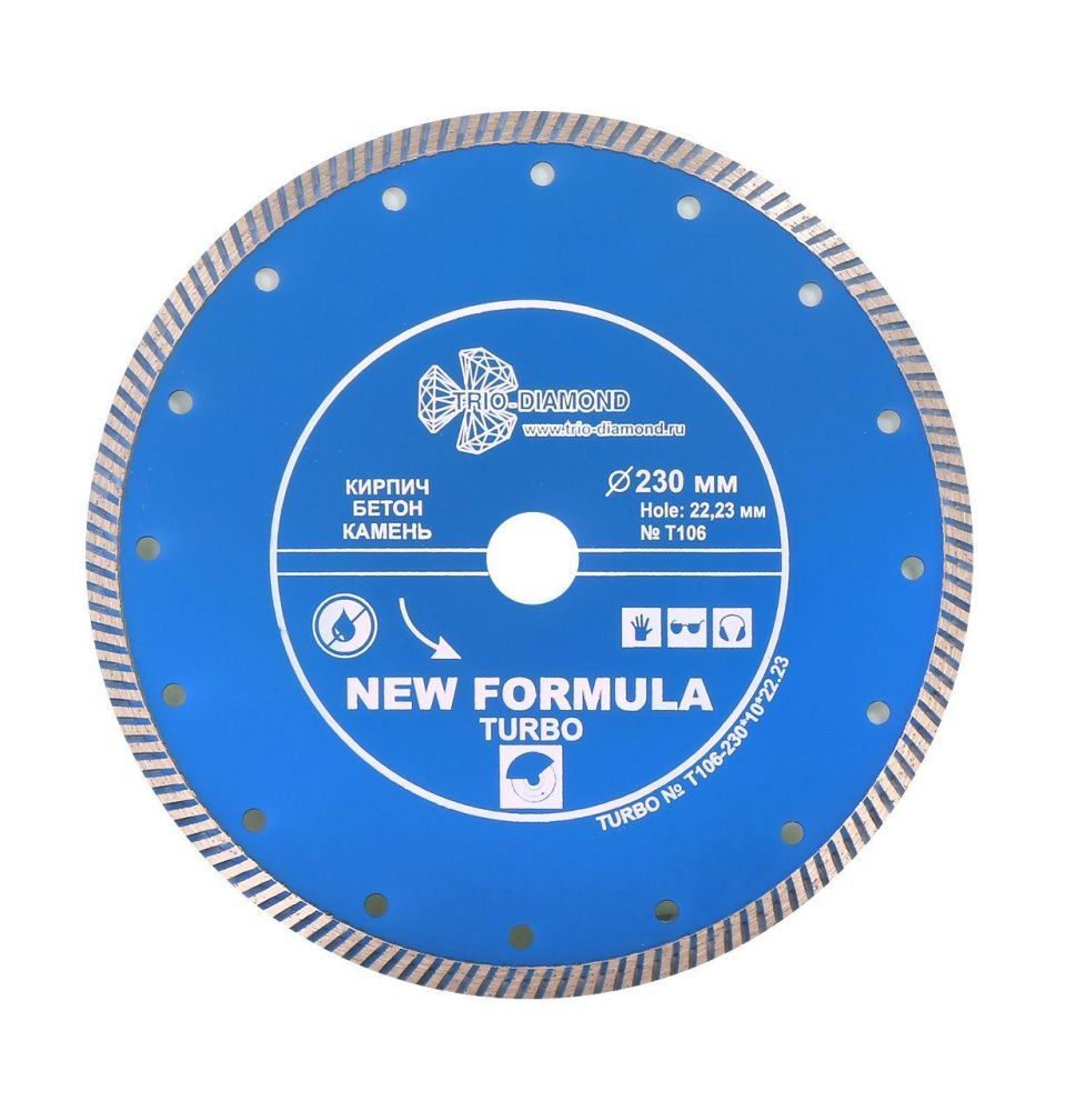 Диск алмазный TRIO-DIAMOND, Турбо New Formula 230*10*22.23 mm Турбо серия New Formula Назначение: для резки широкого спектра твердых и среднеабразивных материалов: бетона, бордюрного камня, кирпича, тротуарной плитки, твердого песчаника, гранита. Особенности: диски с рифленой кромкой, имеют более чистый и аккуратный по сравнению с сегментными дисками рез. За счет турбированной кромки увеличивается скорость реза, отверстия на теле диска способствуют лучшему охлаждению и продлевают срок службы. Подходят как для сухого, так и для мокрого реза. Технология производства: Холодное прессование