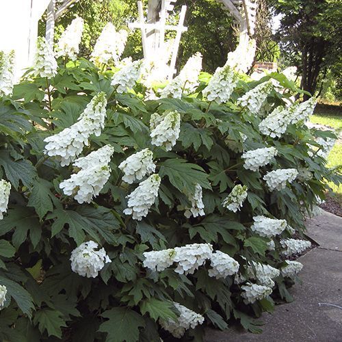 Гортензия дуболистная Айс Кристал - Листья, в отличие от всех остальных гортензий, не цельные, а 3—7-лопастные, похожие на листья дуба, откуда и произошло видовое название. Осенью листья приобретают темно-пурпуровую окраску. Высота куста - 1,5-1,8 м, диаметр кроны - 1-2 м.