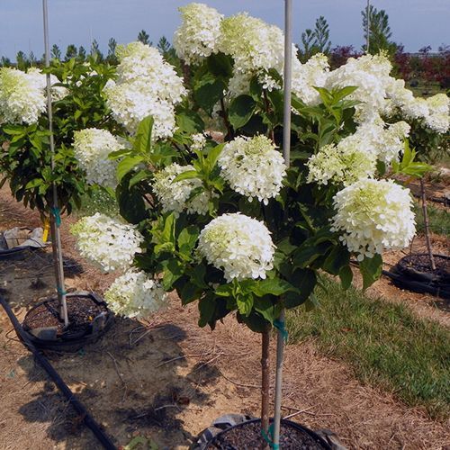 Гортензия на штамбе Фантом 80 см - считается одной из самых красивых среди метельчатых гортензий. Сорт отличается великолепным пышным цветением и неповторимым медовым ароматом, который источают цветки. Среди метельчатых гортензий у этого сорта самые большие конические соцветия, при распускании они светло-кремовые, затем изменяются до слегка розовых, цветение обильное в июле-сентябре, куст выносливый, высотой 200 см, с длинными ветвями, требует солнечного места и влажной почвы. Период цветения: июль-октябрь.