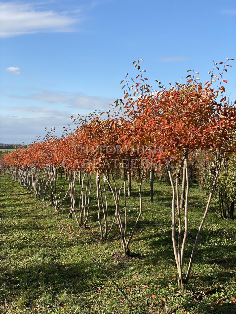 Крупный листопадный кустарник около 5 метров в высоту.. Скелетные ветви восходят косо вверх и формируют массивную, широкую зонтичную крону. Молодые побеги красноватые. Листья удлиненные, при распускании с красноватым или медным оттенком, затем становятся зелёными с сизоватой нижней стороной листа, а осенью расцвечиваются в яркие оранжево-красные и пурпурные тона. Цветет в конце мая белыми цветками звездчатой формы, собранными в кистевидные соцветия. Молодые кисти торчат свечками на ветках, затем повисают. Плоды темно-пурпурные, почти черные, округлые с сизым налетом, съедобные. Созревают в июле. Корневая система неглубокая, хорошо развитая. Растет быстро. Корневой поросли не образует.