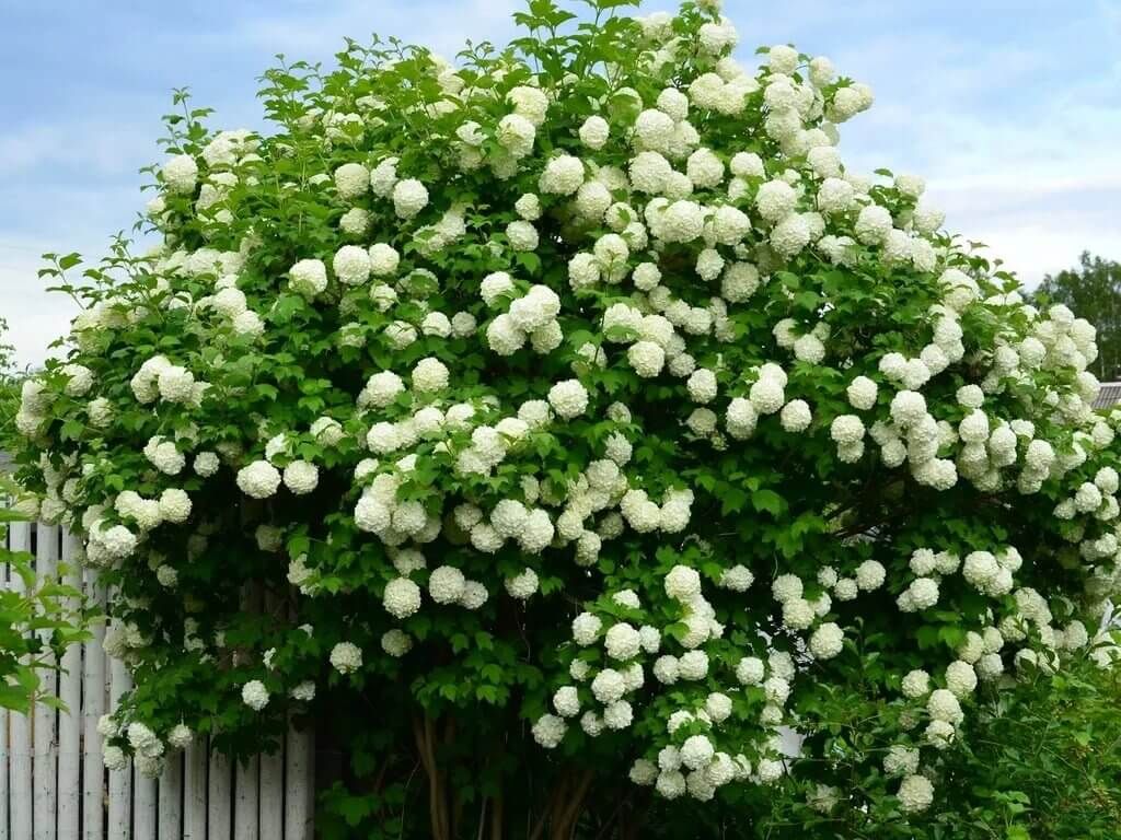 Калина Бульденеж — это раскидистый кустарник, высота до 4м. Цветки распускаются в начале летнего периода, при этом продолжительность цветения — 2–4 недели. Цветет куст обильно: большие пышные соцветия покрывают собой почти всю крону.