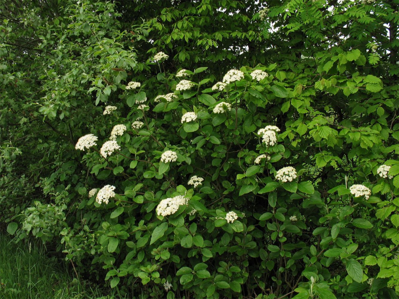 Густооблиственный плотный кустарник высотой до 4-5 м и диаметром кроны свыше 2 метров. Побеги тонкие серые. Листья крупные, плотные, морщинистые, бархатисто-опушенные, темно-зеленые. Ветви облиственные до земли. На верхушках побегов собраны желтовато-белые зонтиковидные соцветия. Цветковые почки не имеют кроющих чешуек. Цветки малоинтересны, распускаются в начале июня, тычинки вдвое длиннее венчика. Цветки душистые Созревание плодов — мозаичное — красно-черное. Овальные блестящие плоды, собраны в щитки сначала зеленые, затем красные, потом чернеют. Плоды не съедобны, созревают с июля по сентябрь. Растет быстро.