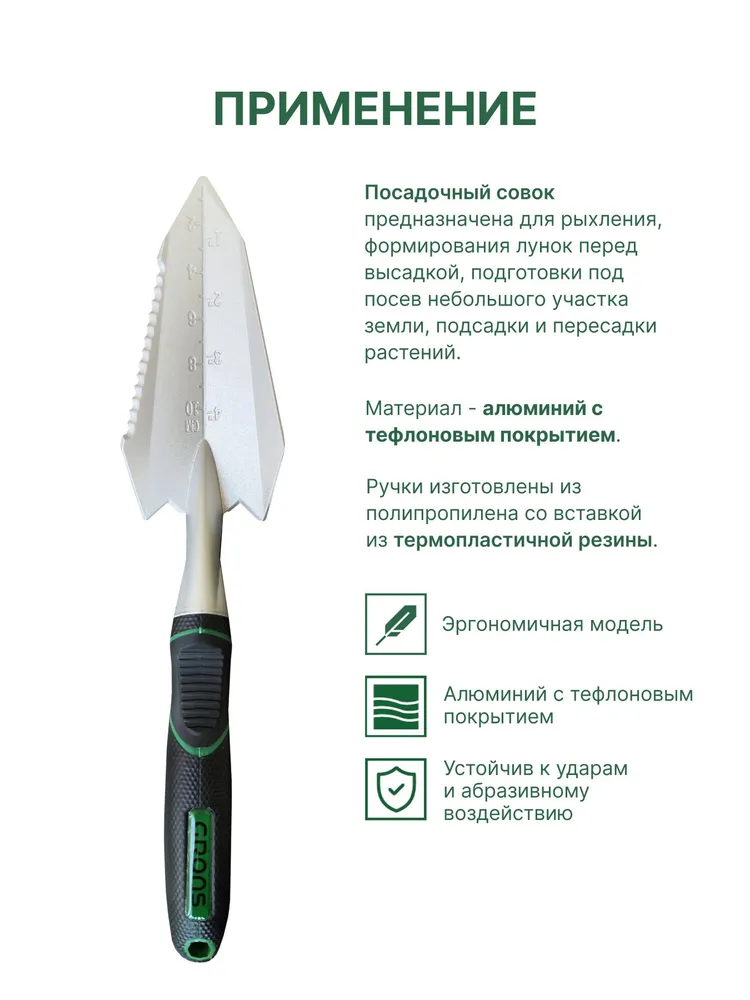Совок посадочный Proftool "Grons" арт. G007 – это незаменимый инструмент для каждого садовода и огородника. Он идеально подходит для пересадки растений, подготовки почвы и выполнения других садовых работ. Изготовленный из высококачественных материалов, этот совок обеспечивает долговечность и надежность в использовании. Его эргономичная форма и удобная ручка позволяют работать с комфортом, не вызывая усталости даже при длительном использовании.