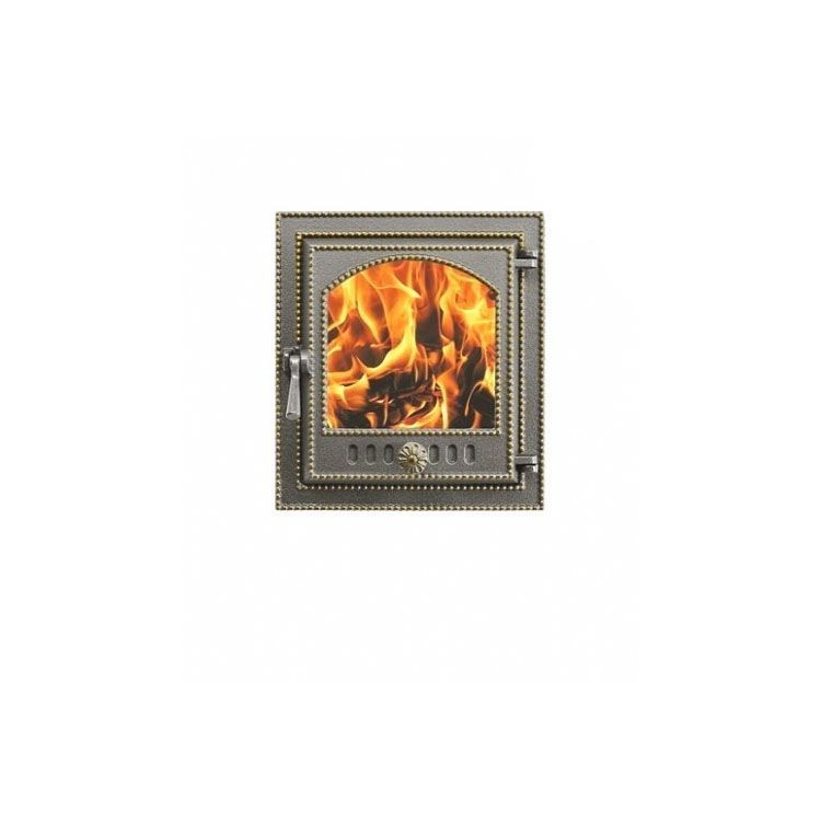 Простая, но очень удобная и привлекательная дверца изготовлена из чугунного сплава и оснащена вставкой из огнеупорного стекла. Последнее позволяет любоваться пламенем практически с самого близкого расстояния, не боясь обжечься. При этом дверца выполнена из чугуна темного оттенка и украшена рельефным рисунком, для которого использовался бронзовый оттенок краски. Герметичная дверца обеспечивает прекрасные изоляционные свойства. Также она отвечает за повышенную пожарную безопасность и предотвращение засора в дымоходе.