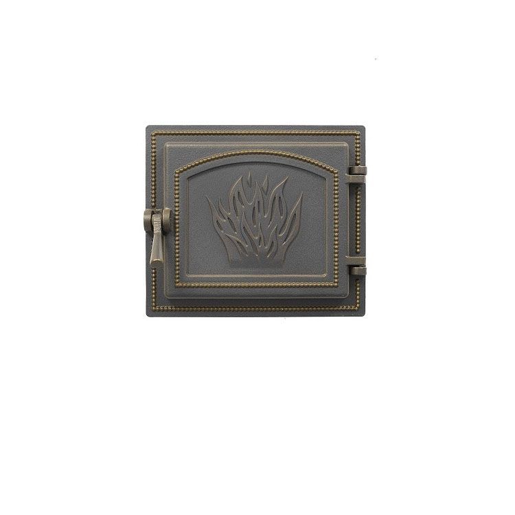 Эта дверца изготовлена из чугуна – прочного и надежного материала. Но выглядит она очень эффектно благодаря тому, что отдельные детали выпуклого рисунка в данном случае подчеркнуты бронзовым оттенком. Помимо интересного дизайна дверцы, следует упомянуть ее превосходные эксплуатационные характеристики. Она обеспечивает контролируемую тягу, которая помогает устранить риск засоров из сажи и копоти. Кроме того, использование дверцы позволяет значительно повысить уровень пожарной безопасности и добиться высокой тепловой эффективности при прежних затратах дров или другого твердого топлива.