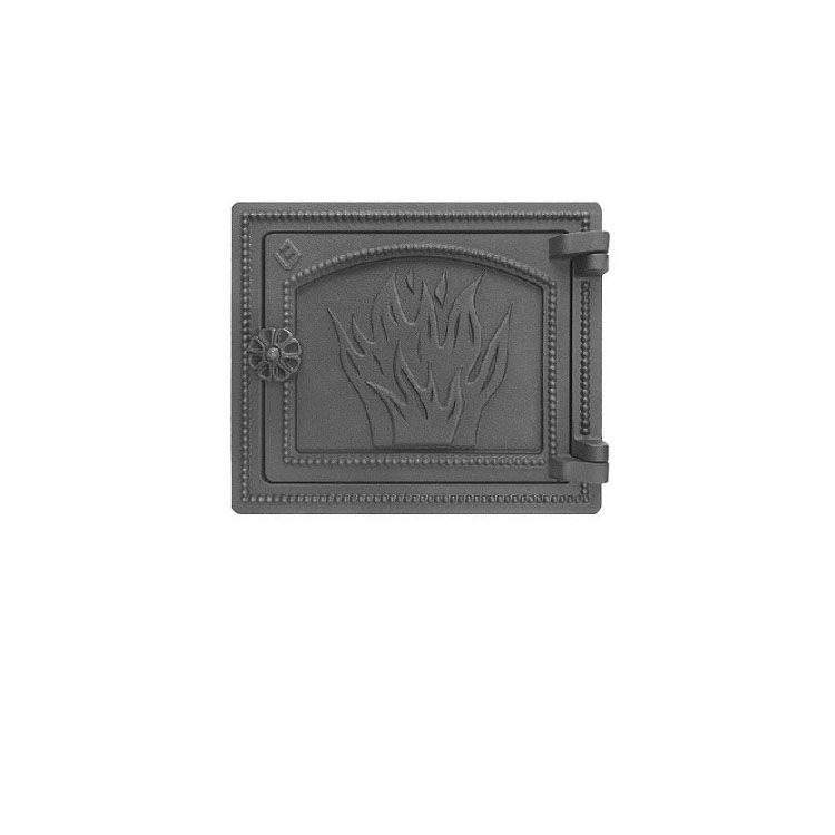 Эта топочная дверца оттенка антрацита выглядит очень эффектно благодаря продуманному дизайну с рельефным узором. Но выполняет дверца не только декоративную функцию. Даже, несмотря на то, что она представляет собой негерметичную конструкцию, такая дверца позволяет значительно повысить уровень пожарной безопасности. Кроме того, как известно, КПД закрытых каминов значительно выше, в их топках выделяется больше тепла, которое используется для обогрева помещения. Тем более, что дверца выполнена из чугуна – металла, равномерно и плавное выделяющего накопленное им тепло.