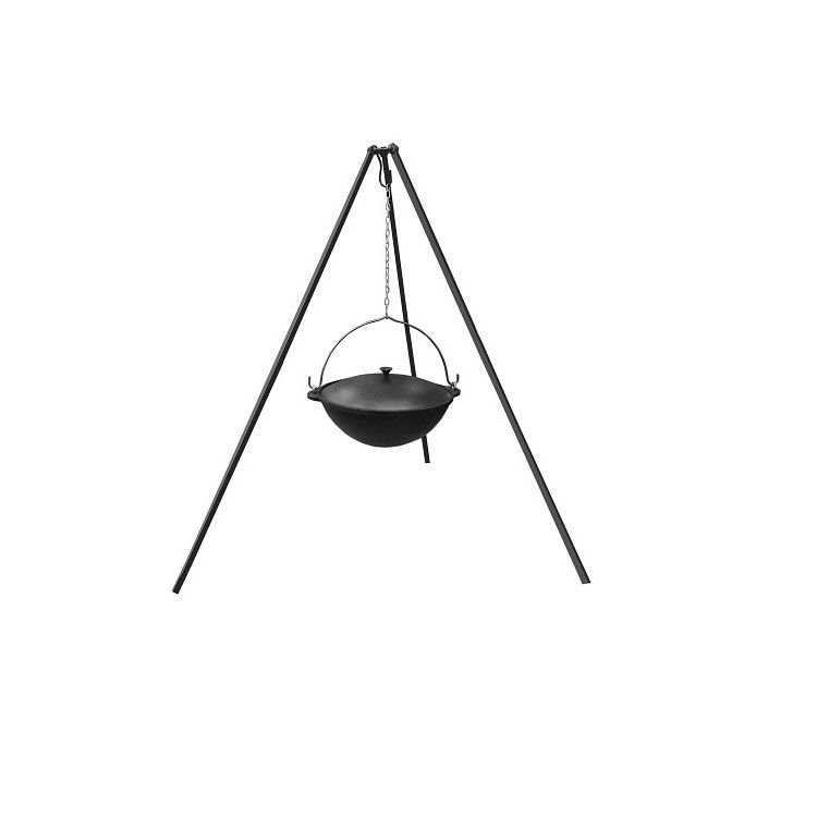 Удобная складная тренога под казан из прочной стали - идеальный походный и дачный вариант для готовки на открытом огне. Конструкция состоит из трёх отрезков арматуры на объединяющем кольце с крюком для казана. Концы прутьев сплющены, что позволяет укреплять треногу в земле. Изделие устойчиво к воздействию влаги, жара и других негативных факторов. Высота более 1 метра позволяет с удобством размешать посуду над огнём, угол размаха ножек легко регулируется. Тренога весит всего 3 кг, в собранном виде легко транспортируется в чехле или обмотке, компактно войдёт в любой багаж. Покрыта чёрной нетоксичной краской.