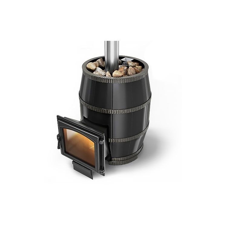 Эта модель обладает всеми преимуществами дровяных печей, к числу которых относятся, например, высокий уровень экологической безопасности и независимость от электро- и газоснабжения, что позволяет использовать устройства этого типа в коттеджах, удаленных от магистральных коммуникаций. Топка этой печи выполнена из чугуна. Для подачи воды предусмотрена установленная в верхней части модели воронка. Камни в закрытой каменке нагреваются круговым пламенем и обеспечивают равномерный прогрев парной. Тепловой мощности такого устройства хватит на помещение объемом до 20 куб.м. Для удержания камней, размещенных вокруг топки, предусмотрен закрытый металлический кожух в виде бочки.