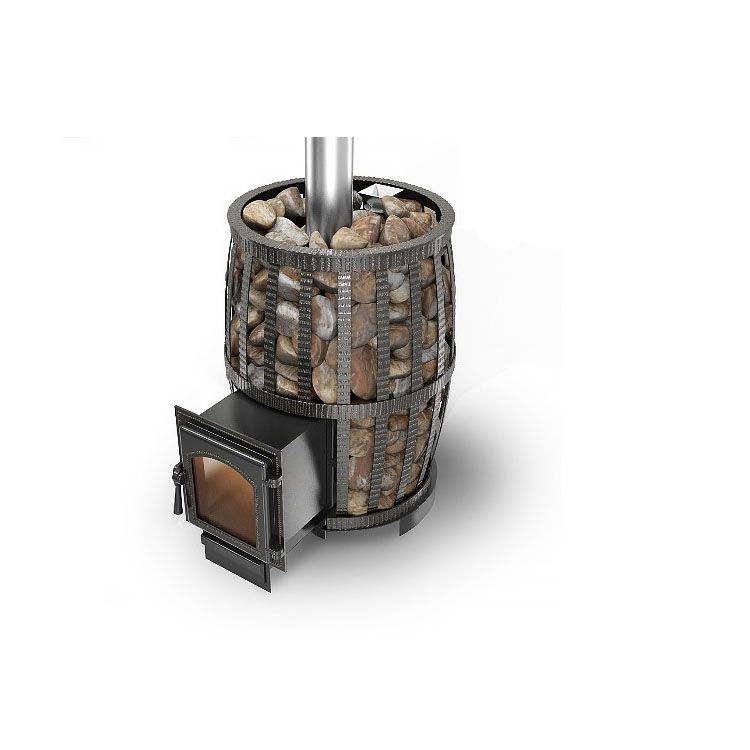 Эта модель представляет собой дровяную печь, оснащенную закрытой каменкой и помещенную в кованый кожух в виде бочки – такое дизайнерское решение смотрится очень стильно, и благодаря этому она прекрасно вписывается в любой интерьер. Топка этой печи выполнена из чугуна, самого эффективного и надежного материала, выдерживающего высокие температуры. Нагрев камней осуществляется таким способом, чтобы парное отделение (а модель рассчитана на помещение объемом 8-20 куб.м) прогревалось равномерно. В каменку загружается большая масса камней, что позволяет аккумулировать тепло и сохранять его в течение длительного времени.