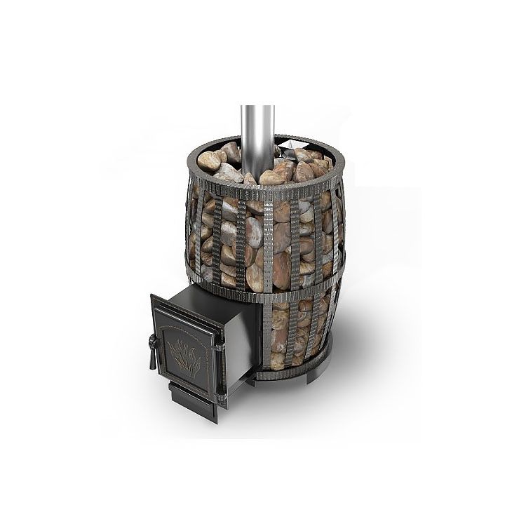 Отличительные особенности этой дровяной печи – глухая топочная дверца из чугуна и стильный кованый кожух, по форме напоминающий бочку. Такая модель станет настоящим украшением интерьера. Она будет удачным приобретением и с точки зрения ее технических характеристик. Нагрев камней производится с помощью кругового потока пламени, при этом воздух в парной не пересушивается, а прогревается равномерно, и в помещении поддерживается оптимальный микроклимат. Большая масса камней позволяет аккумулировать тепло и сохранять его достаточно долго. Подача воды осуществляется непосредственно в центральную часть каменки, для чего используется удобная воронка, установленная сверху.