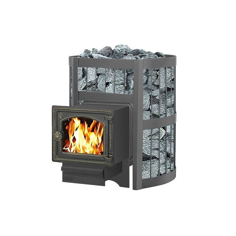 Эта относительно недорогая дровяная печь-каменка для бани обладает небольшой тепловой мощностью и является прекрасным решением для маленькой бани на дачном участке, поскольку рассчитана на обогрев парилки объемом до 14 кубометров. Важной особенностью этой модели является наличие выносной топки. Такое инженерное решение предполагает загрузку дров из смежного помещения, а это означает, что в парилке будет чисто, снаружи не будут заноситься щепки и опилки, да и свободное пространство можно сэкономить – как за счет самой топки, так и за счет того, что не надо будет тут складировать дрова. К числу преимуществ модели относится также топочная дверца из чугуна со вставкой из огнеупорного стекла.