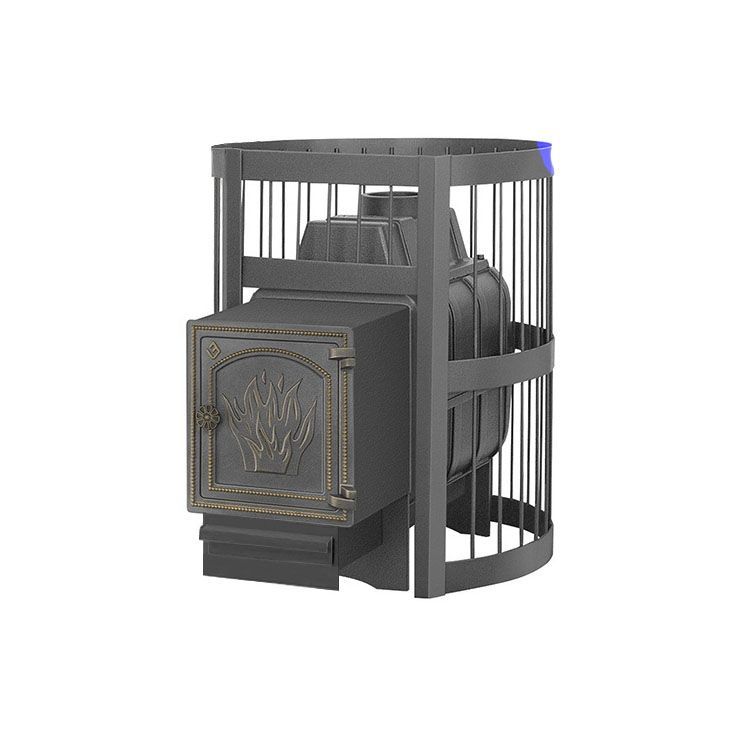У этой модели дровяной печи-каменки есть несколько особенностей. Во-первых, это наличие выносного топочного канала, которая позволяет сэкономить пространство в самой парилке и добиться максимально комфортной и безопасной эксплуатации печи. Во-вторых, это прочный, надежный и вместительный конвекционно-вентилируемый кожух, изготовленный из стали и защищенный слоем термостойкой краски. К слову, сама топка изготовлена из чугуна – это повышает прочность и долговечность модели. В-третьих, это неплохой для таких габаритов уровень тепловой мощности. Эта модель подойдет для парилки объемом до 18 куб. м – этого более чем достаточно для бани в загородном доме.