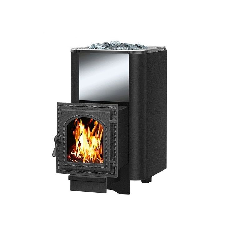 Эта печь для парной рассчитана на обогрев помещения объемом до 24 кубометров. Это надежная и эффективная модель, которая отличается высокой тепловой мощностью и хорошими показателями производительности. Одним из ее преимуществ является наличие выносной топки, позволяющей топить печь из соседнего помещения. Кроме того, следует отметить достаточно большой объем каменки, благодаря которому можно использовать большее количество камней, что, в свою очередь, позволяет лучше аккумулировать тепло. Динамичный прогрев воздуха достигается за счет прогрева камней с четырех сторон. Модель снабжена красивой топочной дверцей с жаропрочным стеклом.