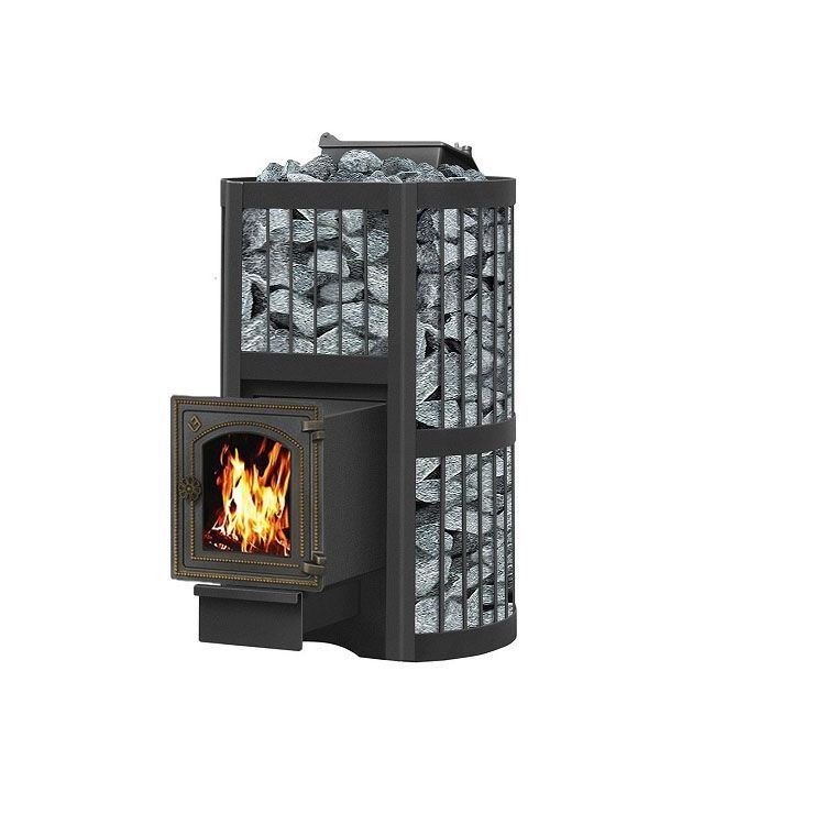 Традиционная дровяная печь-каменка – это оборудование, которое будет работать независимо от наличия магистрального газоснабжения. Эта модель, обладающая хорошей теплоотдачей и тепловой мощностью, обеспечивает обогрев помещения парилки объемом в 18 кубометров, а топлива при этом расходуется мало. Вместительный (в рамках общих параметров печи) конвекционно-вентилируемый кожух модели из конструкционной стали толщиной 6-8 мм. Топочная дверца снабжена вставкой из жаропрочного стекла. В целом же эта конструкция, как и ряд других деталей, отлита из чугуна. Это надежный и долговечный сплав, именно он обеспечивает повышенные эксплуатационные характеристики колосника и дверцы.