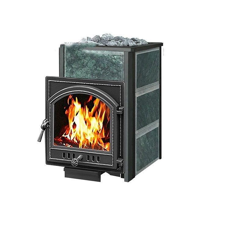Модель банной печи выполнена в современном унифицированном дизайне, способна украсить любой интерьер русской бани или финской сауны. Изделие изготовлено из чугуна, облицовано горной породой. Змеевик – прочный камень, который придает конструкции дополнительную прочность. Банная печь устанавливается в соседнем с парной боксе. Простая конструкция имеет герметичную топку с дверцей, конвекционный кожух, закрытую каменку для нагрева камней. Заложенные в печь камни прогреваются до нужной температуры и надолго сохраняют свой жар. Банная печь может эксплуатироваться более 30 лет.