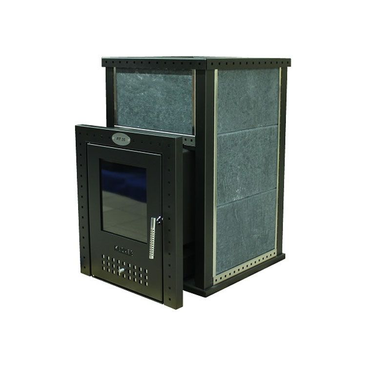 Эта модель представляет собой дровяную печь для русской бани. Ее топка изготовлена из особой марки жаропрочной стали толщиной 5 мм. Облицовка печи выполнена из натурального камня – покупатель может выбрать талькомагнезит, жадеит и серпентинит. Помимо превосходных декоративных свойств, все эти виды камня отличаются способностью аккумулировать тепло, а затем равномерно его отдавать в течение длительного времени. Облицовка из натурального камня как бы смягчает тепловое излучение от стальной топки, и благодаря этому воздух не пересушивается, а в помещении создается максимально комфортный микроклимат.