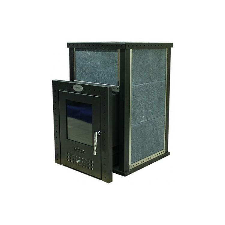Дровяная печь с закрытой каменкой - это всегда хороший вариант для русской бани. Эта модель, к тому же, рассчитана на достаточно большой объем парного отделения - до 35 кубометров. Рабочая температура - до 800 градусов. Топка этой печи изготовлена из жаропрочной стали, а топочная дверь снабжена стеклом, выдерживающим высокие температуры и позволяющим любоваться танцем пламени. Каменная облицовка печи помогает аккумулировать и равномерно распределять тепло, не пересушивая воздух в помещении. Возможно подключение к дымоходу с трех сторон. Гарантия на эту модель дается на 5 лет.