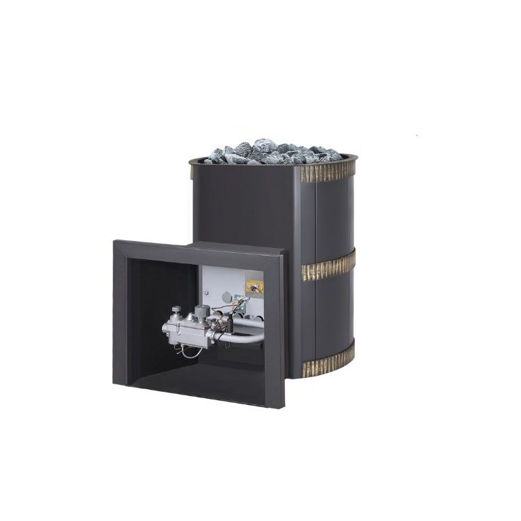 Газодровяная печь – это возможность добиться максимально высокой эффективности при относительно небольшом уровне расходов. Газовая горелка в ее комплектацию не входит, но ее можно будет приобрести и установить отдельно. Это даст возможность использовать более эффективное топливо – газ. Это позволяет быстро прогреть помещение, а желаемая температура в нем будет поддерживаться за счет того, что камни могут держать тепло в течение длительного времени. Топка модели изготовлена из конструкционной стали, способной выдерживать высокие температуры, а вот топочная дверца – из более дорогого чугуна, обладающего повышенными эксплуатационными характеристиками.