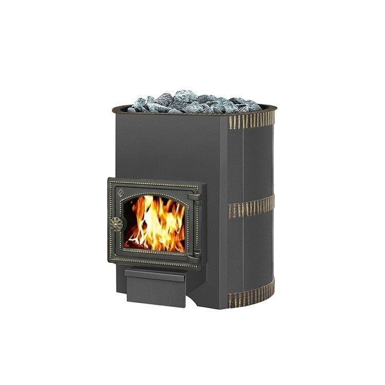 Эта модель печи-каменки рассчитана на обогрев парильного помещения объемом до 14 кубометров. Она оснащена сплошным конвекционно-вентилируемым кожухом из конструкционной стали. Еще одна ее особенность – чугунная топочная дверца с огнеупорным стеклом. Печь не оснащена выносной топкой, но этого решения есть целый ряд преимуществ, к числу которых относятся отсутствие потерь тепла и расходов на дополнительную теплоизоляцию. Кроме того, такая конструкция является более простой в исполнении, что помогает сэкономить на монтажных работах. Еще один плюс – более простая регулировка температуры, причем для этого не нужно выходить из парной.