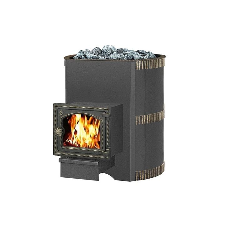Эта модель дровяной печи-каменки рассчитана на обогрев парильного помещения объемом до 14 кубометров. К числу ее особенностей относится наличие вместительного сплошного конвекционно-вентилируемого кожуха и топочной дверцы, отлитой из чугуна и оснащенной жаропрочным стеклом, через которое можно любоваться пламенем. Кожух изготовлен высокопрочного стального сплава – он устойчив и к нагреву, и к механическим нагрузкам. Модель снабжена выносным топочным тоннелем. Благодаря этому топить ее можно из расположенного рядом помещения, что означает экономию пространства и повышенный уровень безопасности эксплуатации. Срок службы печи составит не менее 10 лет.