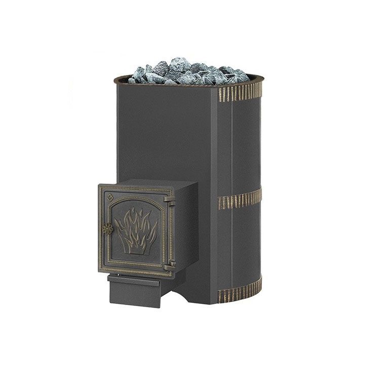 Эта модель банной печи отличается достаточно высокой тепловой мощностью. Ее хватит для того, чтобы обеспечить обогрев парильного помещения объемом в 30 кубометров. Отличительными особенности этой модели – вместительный кожух, в который можно загрузить соответствующее количество камней (до 50 кг), а также колосниковая решетка, отлитая из чугуна – она также отвечает за длительное горение топлива и его низкий расход. Использование чугуна помогает продлить ресурс ее работы. Глухая топочная дверца сделана из чугуна – она смотрится очень гармонично даже без стеклянной вставки.