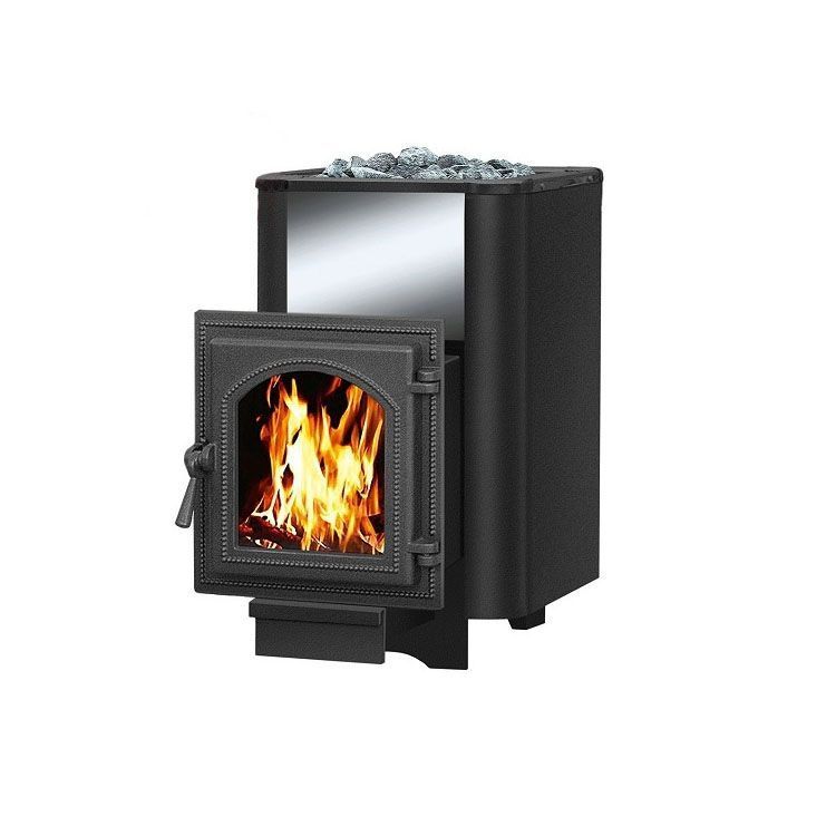 Традиционная дровяная печь-каменка – это непременный элемент русской бани. актуальной всегда. Эта модель обеспечивает обогрев помещения парилки объемом в 18 куб. метров – вполне достаточно для частного дома. Кожух, предназначенный для поддержания конвекционных процессов, сделан из конструкционной стали, устойчивой к высоким температурам. Полотно дверцы для топки, на которые постоянно действует температура самого пламени, изготовлена из чугуна. Из этого же долговечного материала произведена колосниковая решетка, которая придает таким элементам устойчивость к тепловым деформациям. Это обеспечит пролонгированный срок их службы.