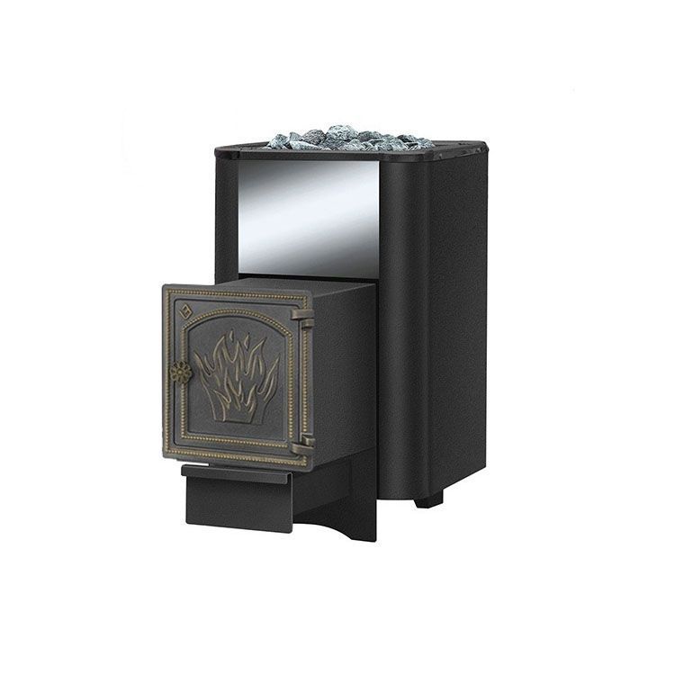 Эта дровяная печь-каменка предназначена для обогрева парильного помещения объемом до 18 кубометров. Одним из главных ее преимуществ является эффектный дизайн. Особого упоминания заслуживает сплошная топочная дверца с замысловатыми узорами, отлитая из чугуна. Она сама по себе станет украшением помещения. В модели предусмотрен топочный тоннель, который позволяет загружать дрова из смежного помещения. В ряде случаев такое конструкционное решение является наиболее удобным. К числу преимуществ этой модели относятся хорошая теплоотдача, равномерное распределение тепла, большая вместительность конвекционно-вентилируемого кожуха.