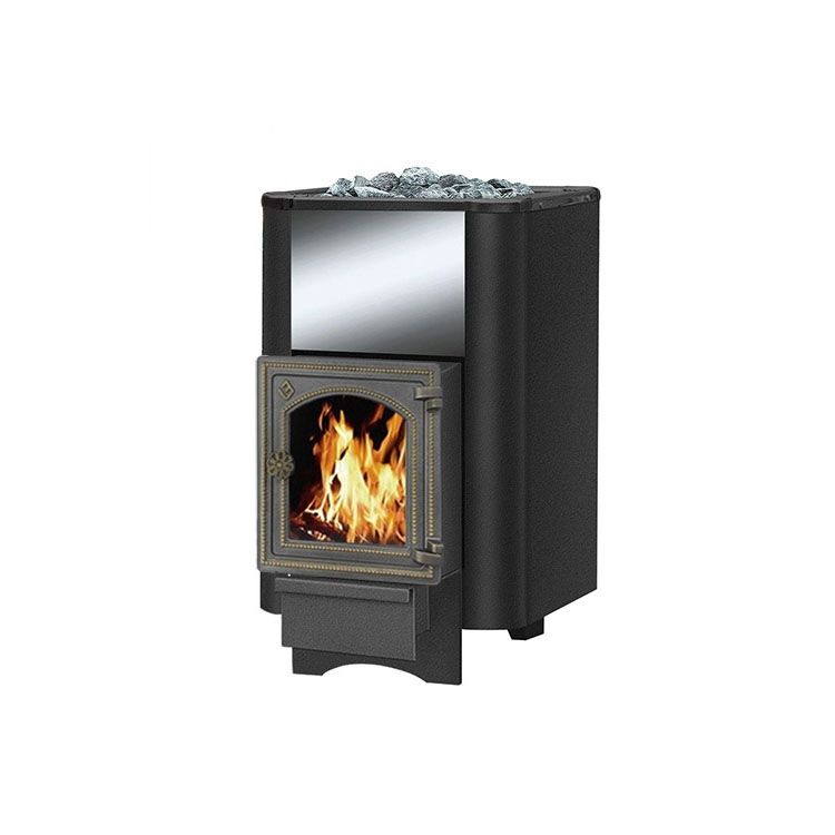 Эта модель дровяной печи-каменки для бани рассчитана на обогрев парилки объемом до 18 кубометров. Ее отличительными особенностями являются способность равномерно прогревать помещение, отдавая тепло от собравших его камней (а для них предусмотрен вместительный кожух), а еще - наличие на топочной дверце огнеупорного стекла, необходимого как для безопасности, так и для декоративных целей. Модель не оснащена выносной топкой, но многие пользователи рассматривают это как преимущество. Это более бюджетный вариант, который исключает потери тепла, поэтому, не нужно тратить средства и силы на устройство дополнительной изоляции. Да и регулировать температуру здесь намного проще.