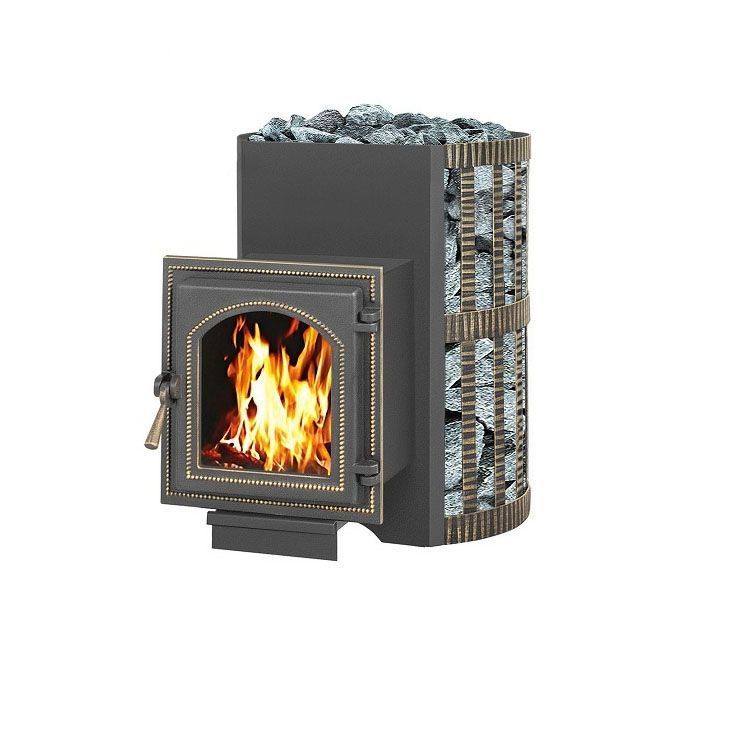 Традиционная дровяная печь-каменка всегда смотрится очень привлекательно. Особенностью же этой модели является кованый кожух – это очень красивая деталь. Что касается эксплуатационных характеристик, то мощности этой модели хватит для обогрева помещения парилки объемом в 24 кубометра. Кожух модели, выполняющий функцию поддержки конвекционных процессов, сделан из высокопрочного стального сплава. Топочная дверца снабжена вставкой из безопасного жаропрочного стекла и отлита из чугуна, так же, как и колосник. Именно этот материал обеспечивает им устойчивость к деформациям, которые неизбежно возникли бы под действием высоких температур.