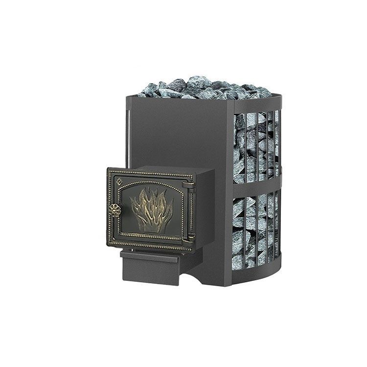 Эта дровяная печь для бани работает независимо от электро- и газоснабжения. Она рассчитана на помещение объем до 14 кубометров. Отличительными ее особенностями являются наличие выносной топки, что позволяет топить печь из помещения, соседнего с парильным отделением, а также наличие кожуха-сетки, рассчитанного на большую загрузку камней. Для печей такого типа чем больше их загрузка – тем выше тепловая мощность, тем дольше печь сохраняет свое тепло даже после того, как огонь погаснет. Топка модели изготовлена из жаропрочной стали, а вот топочная дверь сделана из чугуна и украшена стильным орнаментом.