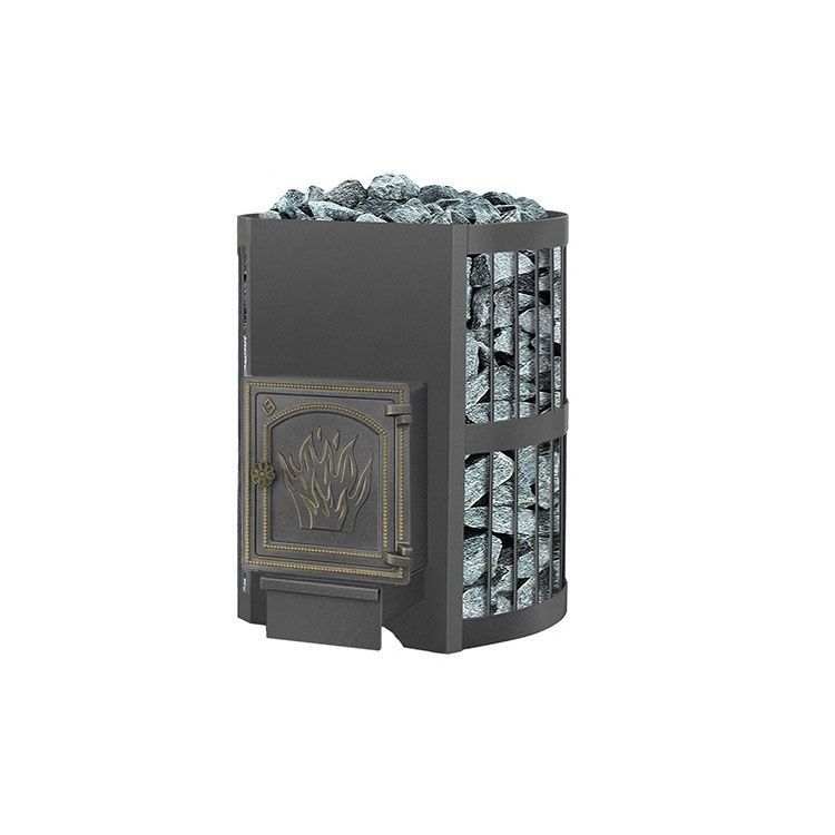 В этой модели дровяной печи для бани не предусмотрен вынос топки, зато конструкцией здесь обеспечена возможность управления отоплением непосредственно из парильного помещения. В целом печь рассчитана на сравнительно небольшую парилку объемом до 18 кубометров. При этом она обладает всеми преимуществами таких печей, включая независимость от центрального газо- и электроснабжения, высокий уровень экологической безопасности, равномерный прогрев помещения (это обеспечивается возможностью использовать много камней – они аккумулируют тепло, а затем постепенно отдают его во внешнюю среду).