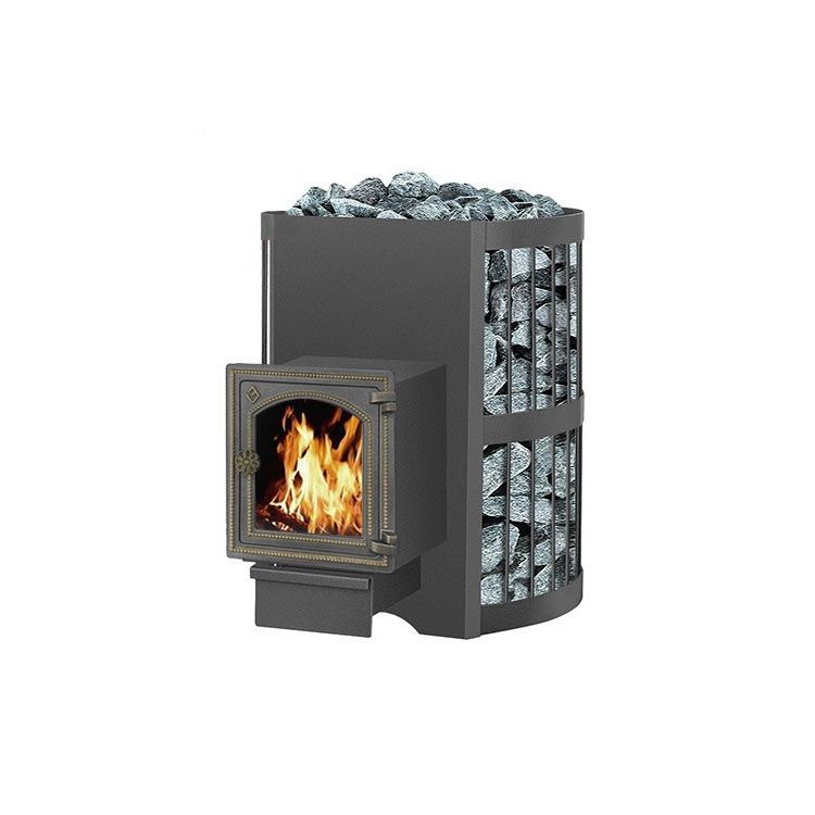 Эта печь для бани обладает достаточно высокой тепловой мощностью, что позволяет использовать ее для обогрева парильного отделения объемом в 18 кубометров – для загородного дома этого вполне достаточно. Модель оснащена выносной топкой. На практике это означает закладку дров из расположенного через стенку помещения. Это приводит к увеличению свободного пространства, и многие потребители предпочитают именно этот вариант. Конвекционно-вентилируемый кожух изготовлен из конструкционной стали. Остальные элементы, подвергающиеся прямому воздействию пламени и высоких температур, отлиты из чугуна.