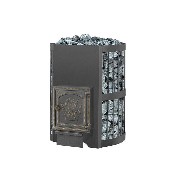 Эта модель дровяной печи рассчитана на достаточно большое парильное отделение объемом до 24 кубометров. Она укомплектована выносной топкой, что позволяет топить печь не из самой парилки, а из смежного с ней помещения. С точки зрения своего устройства такая печь состоит непосредственно из топки, изготовленной из жаропрочной конструкционной стали и оснащенной глухой чугунной дверцей с красивым орнаментом, и конвекционно-вентилируемого кожуха, собранного из калиброванного прута. Вместительный кожух нужен для загрузки камней – большое их количество позволяет лучше аккумулировать тепло и потом равномерно прогревать весь объем помещения.