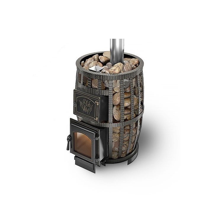 Одним из преимуществ этой дровяной печи-каменки для бани является ее оригинальный стильный дизайн. Кованый конвекционно-вентилируемый кожух напоминает по форме бочку. Он является достаточно вместительным для того, чтобы загрузить туда большое количество камней, а это обеспечивает хорошую теплоотдачу и равномерный прогрев помещений. Топочная дверца снабжена огнеупорным стеклом – это еще один красивый дизайнерский прием. Также преимуществом этой модели является высокий показатель тепловой мощности. Благодаря этому с ее помощью можно обогревать парилку объемом до 26 кубометров.