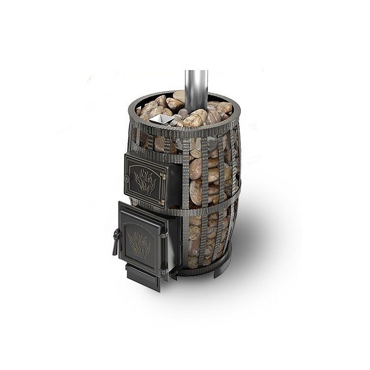 Дровяные печи-каменки для бани – это традиционное инженерное решение, которое никогда не утратит своей актуальности. Для загородных домов и дач они зачастую являются идеальным вариантом, поскольку их работа не зависит от наличия центрального газоснабжения и электроэнергии. Эта модель обладает, к тому же, высокой тепловой мощностью и обеспечивает обогрев парильного помещения объемом до 26 кубометров. К числу ее особенностей относятся также наличие вместительного кованого конвекционно-вентилируемого кожуха типа «сетки» и красивой сплошной топочной дверцы, для изготовления которой использовался чугун.